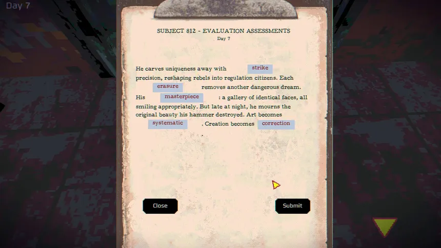 Velvet Hammer is an atmospheric tile game that fuses narrative curiosity with meaningful choices: Easy to learn, hard to forget. Over 12 days, you endure , and you navigate inter-day word-matching evaluations that measure (and manipulate) your identity.