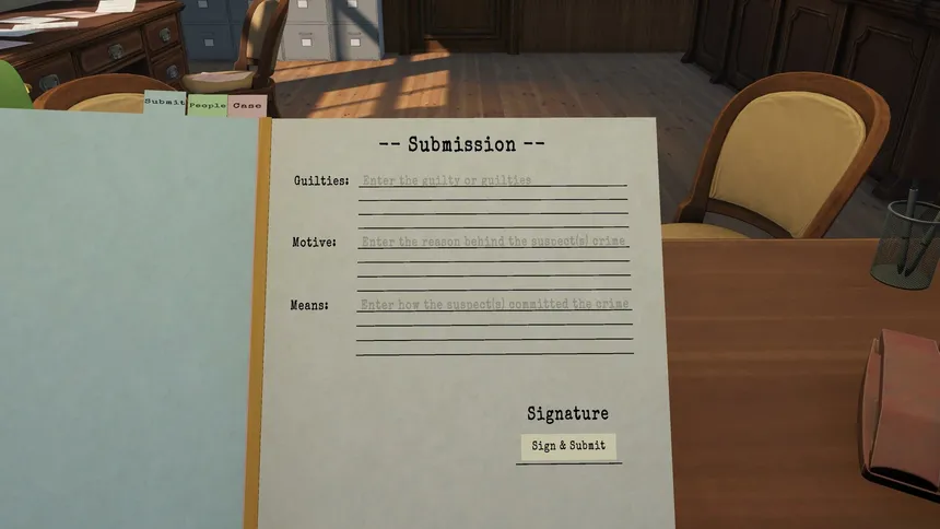 Будьте готовы к непредсказуемости. Ваши вопросы и стиль общения формируют ход беседы, а значит, и исход дела. Когда соберёте достаточно информации, останется лишь составить финальный отчет, указав виновного, его мотивы и способ совершения преступления. Ошибки не прощаются — каждое решение имеет последствия.