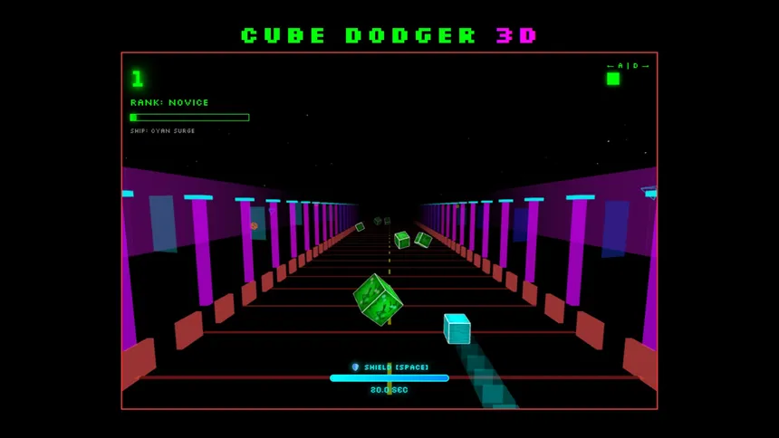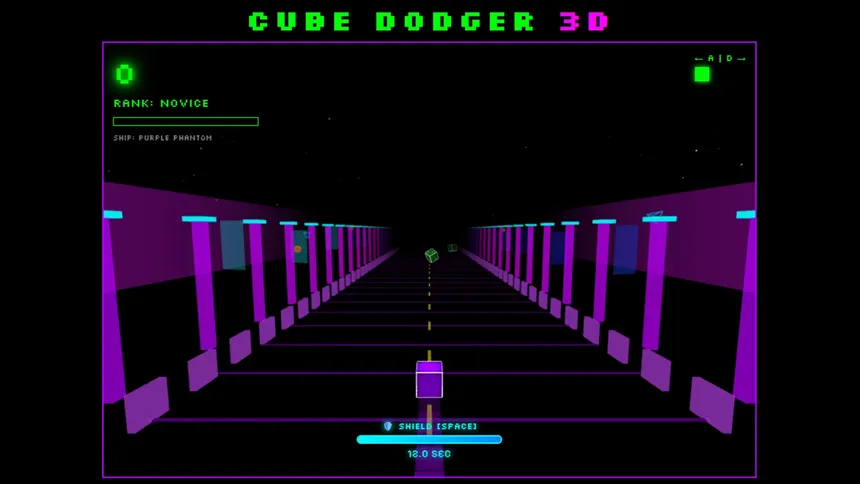 Cube Dodger 3D is a fast, neon arcade runner. Slide along a glowing highway, dodge smarter and faster cubes, charge your shield, unlock ships, roads and enemy skins, and chase brutal score-based Steam achievements