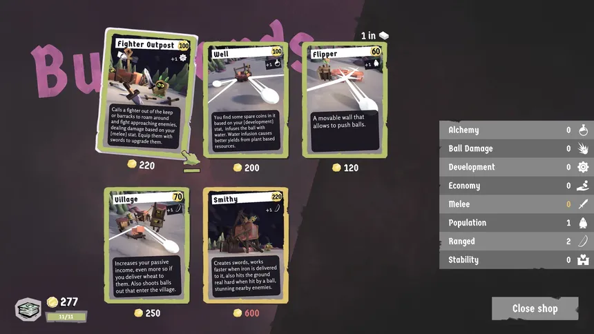 Но битва — это не только умелое управление флипперами. PinKeep предлагает глубокую систему строительства колоды, где каждое новое здание — это шаг к победе. Возводите деревни для стабильного дохода, воинские аванпосты для агрессивной защиты, дополнительные флипперы для еще большего контроля над шариком… и это лишь малая часть арсенала, доступного вам. Стройте, улучшайте и адаптируйтесь к постоянно меняющимся условиям.