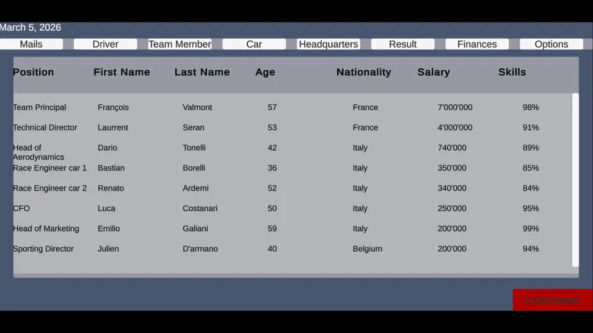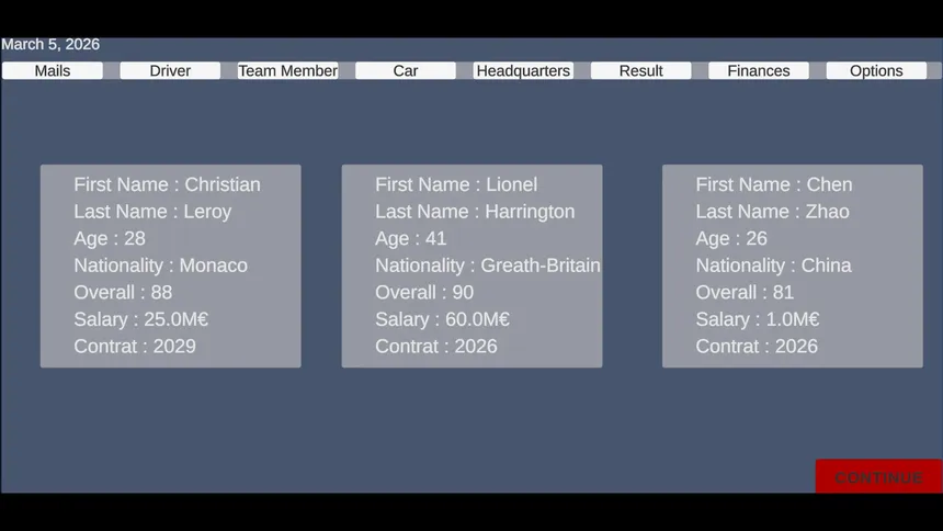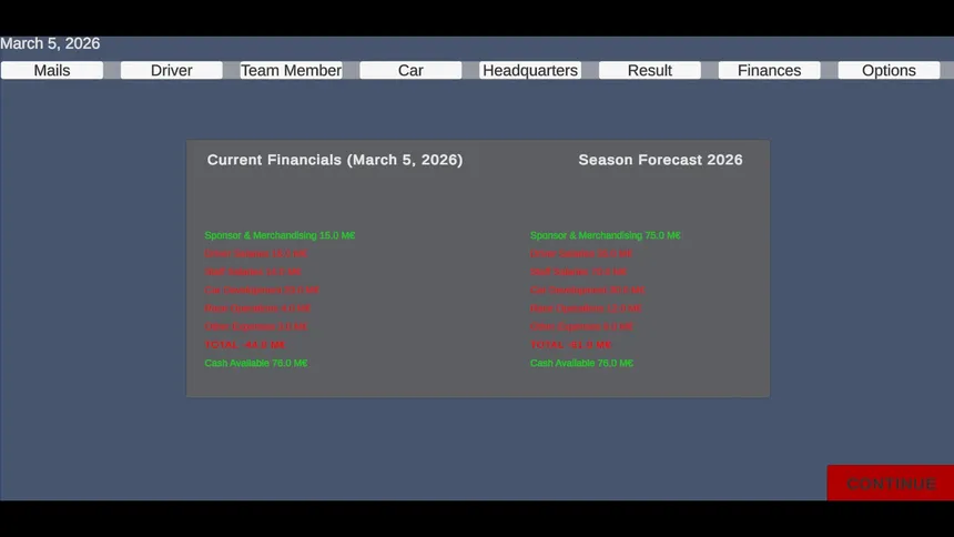 Manage your racing team: strategy, tires, staff, budget, and real-time decisions. Build the perfect crew and lead them to victory in this immersive motorsport management game.