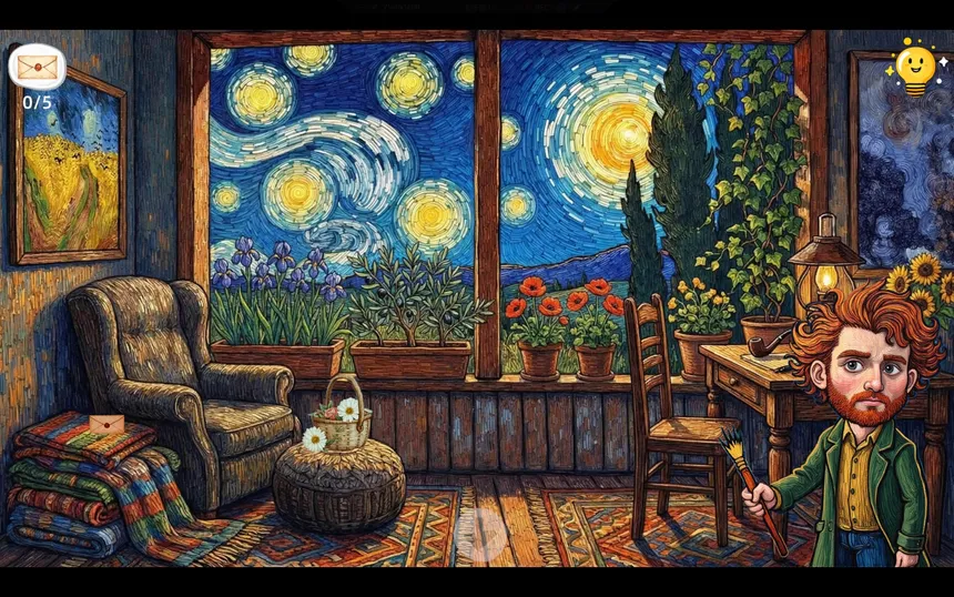 a lightweight immersive hidden-object title spanning Van Gogh’s 5-chapter artistic life—20+ Post-Impressionist scenes, partner a cat to gather tools/relics, unlock stories/art history charm, 1-2hr, moderate difficulty, multi-language/hint toggle, informative fun time-travel.