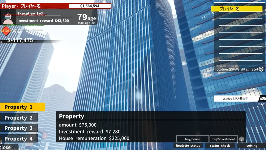 A life simulation game for up to 6 online players.Become a resident of Shishizaka City and aim to become the richest by getting jobs, changing careers, buying properties, getting married, raising children, and using cards.Experience a turbulent life in a vast city!