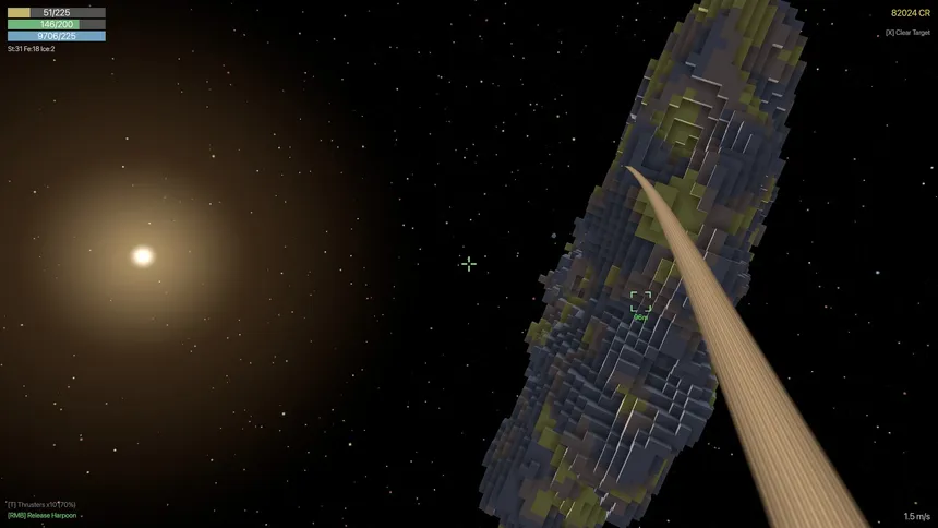 Tame spinning asteroids with harpoons and thrusters. Mine them for profit. Upgrade your ship. A physics sandbox where every rock fights back.