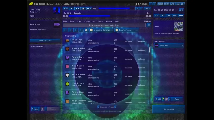 Low-level drug-dealing and psychonautic text-based simulation game with role-playing elements inspired by rave and electronic music culture.