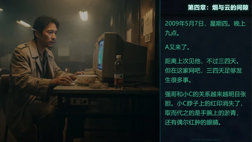 "Archive 9 - Network Administrator's Chapter" is a visual novel depicting the era of economic transformation. It allows players to experience the life of those marginal youth in 2009, the time before the advent of mobile internet, from the perspective of a network administrator.