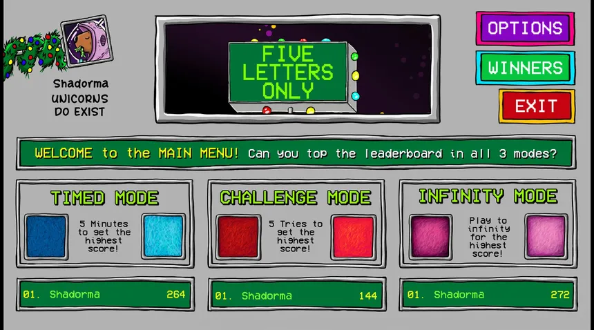 Five Letters Only is a fun, competitive word game. Submit 5-letter words for the highest scores. Climb to the top of all 3 leaderboards and be the best in the universe! Unlock new button themes. Adjust the background music, click sounds and other audio. No ads or in app purchases.