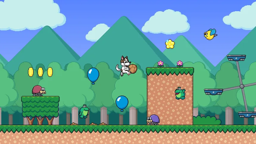Join Rondo, a cheerful Akita pup, as he explores 8 whimsical worlds, digging up coins, items, and throwable objects to solve puzzles, battle enemies, and uncover secrets... all with the charm and challenge of a classic 2D platformer!