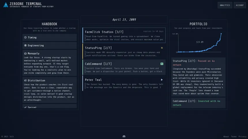 ZeroOne Terminal — игра от компании Jolt, разработанная для платформы PC. Проект совмещает в себе такие жанры и элементы, как симулятор и стратегия. Дополнительно игроки выделяют такие особенности игры, как стратегия, расследования, логика и капитализм. Игра рассчитана на одиночное прохождение, многопользовательские режимы не предусмотрены.