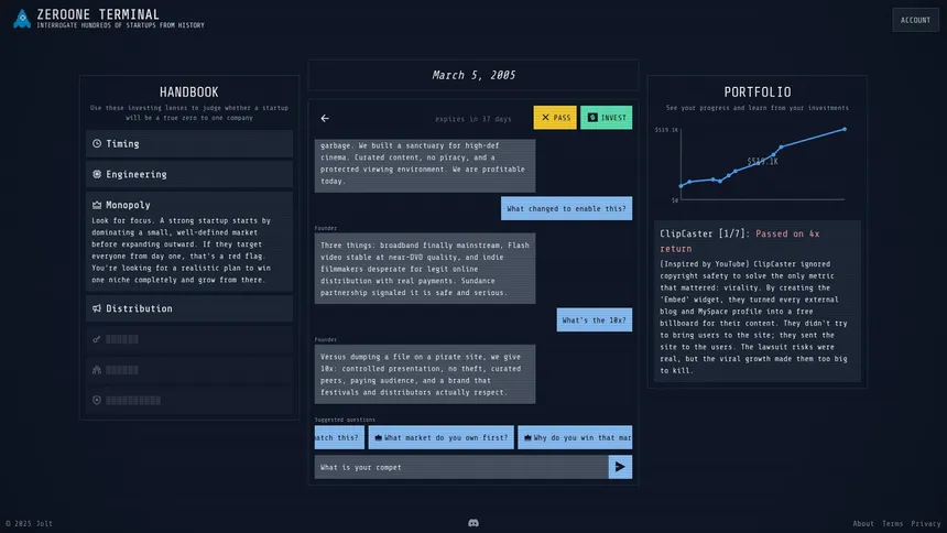Learn how VCs spot winning startups by investing in 20 years of tech history. Interview founders, apply Zero to One principles, and see if you can predict the next Google or Airbnb.