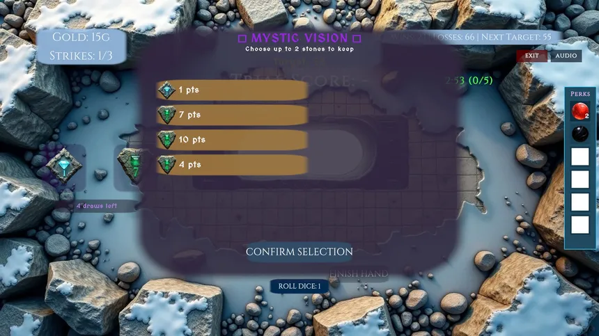 Рогалик-головоломка, в которой вы тянете мистические камни, чтобы достичь целевых очков в 100 испытаниях. Собирайте масти для множителей до ×20, создавайте группы для бонусов и избегайте штрафов биома. Три страйка завершают забег. Босс-испытания сокращают доборы с 4 до 3.