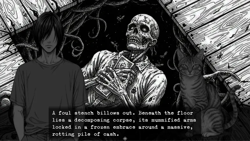“The Lucky Stray Cat” is a hybrid Dungeon Crawler and Visual Novel, told through an urban horror narrative reminiscent of Junji Ito’s storytelling style.