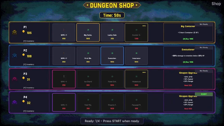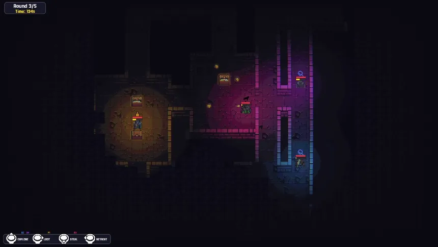 Chaotic local multiplayer roguelite for 2-4 players. Command robots through deadly dungeons - but don't control them directly. Issue AI directives, grab cursed treasures, steal from friends, and escape before the Wall of Doom rises.