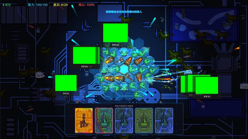 A cyberpunk tower defense with roguelike card mechanics. Deploy unique towers on hexagonal grids, strengthen your defense with tactical chips, and battle malicious codes. Build your defense through random card draws, use high-tech weapons to repel 20 waves and beat the boss.