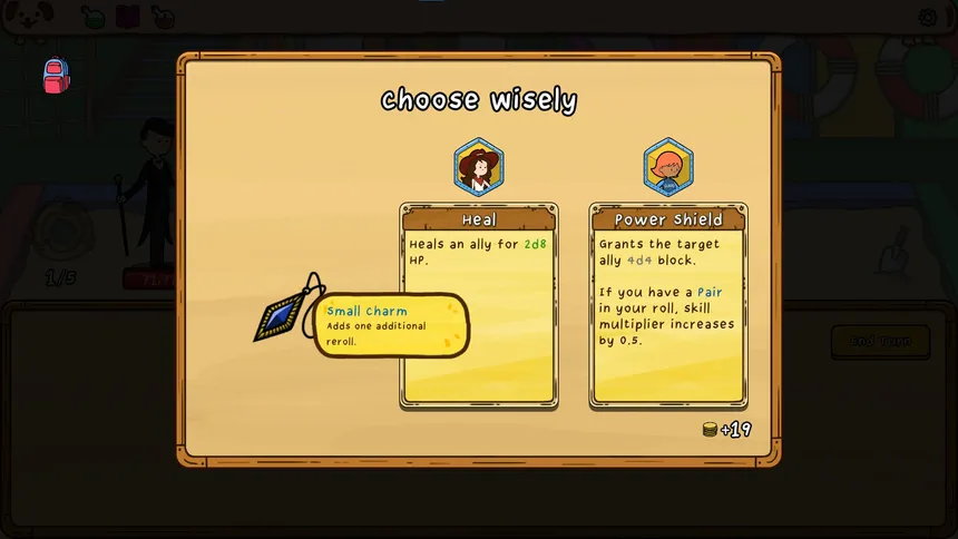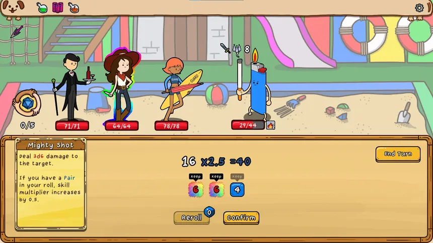 Build your combat strategy through dice combinations. This is a roguelike deckbuilder focused on rolling and combining dice. Each turn, you use dice results to enhance or alter skill effects.