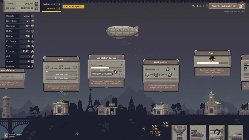 Build a global oil empire in this 2D idle clicker. Construct buildings, produce goods, manage finances and reputation, and sell oil worldwide. Grow from a small refinery to a powerful corporation.