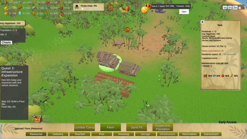 Build and manage a tropical island economy, optimize production chains, research new technologies, and defend your growing settlement against pirate threats in this relaxing yet strategic city-building game.