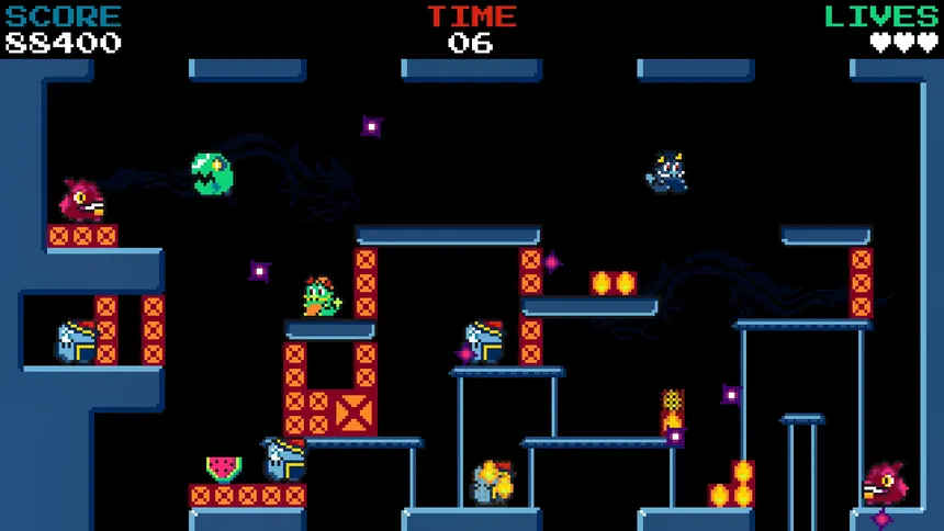 Play as a fire-breathing dragon in this classic arcade platformer! Blast through destructible stages, incinerate your enemies, and chase the high score, solo or alongside a friend.