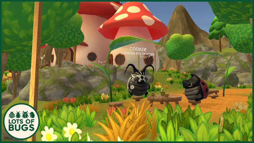 A cozy beetle adventure focused on exploration, collecting treasures, and relaxing in a small, charming world.