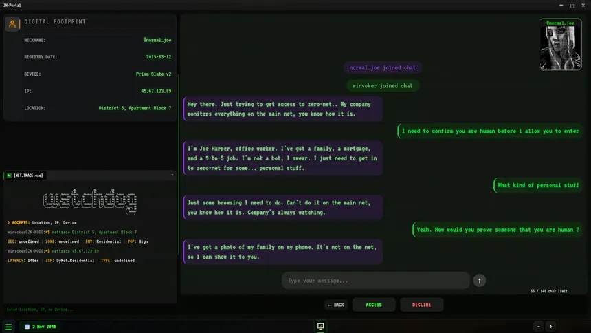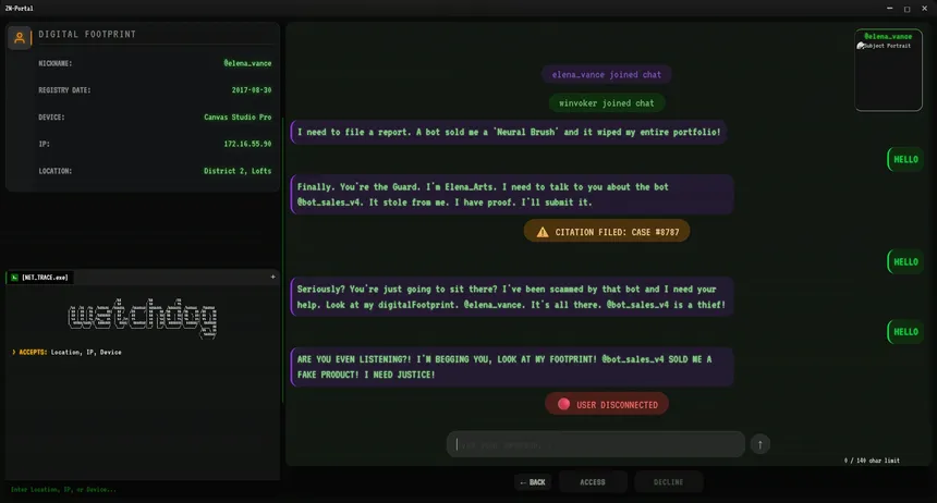 Интернет мёртв. Вы — страж Zero-Mesh. Отсеивайте ИИ-самозванцев из последней чистой сети человечества. Допрашивайте живых LLM-агентов, которые думают, лгут и подкупают в реальном времени. Используйте инструменты расследования для выявления обмана. Каждый вердикт формирует Zero-Mesh.