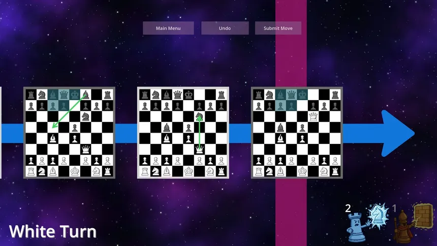 We combined various novel chess variants together in a single game. Time travel your pieces to new timelines! Cast spells to secure an advantage! Navigate around slimes following cellular automata rules!