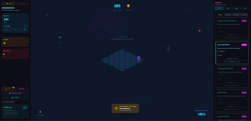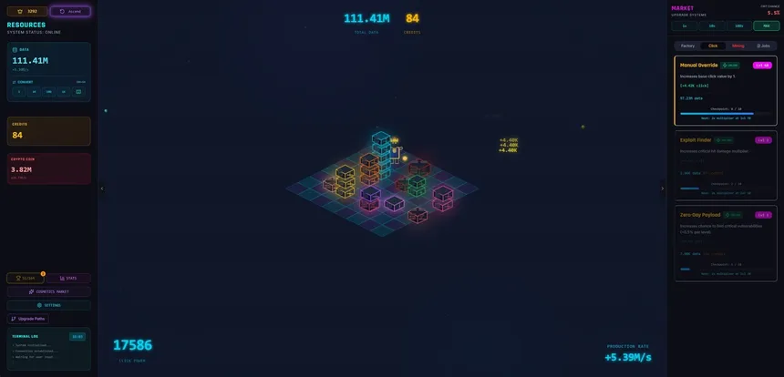 DataFall is a cyberpunk idle clicker where automated systems grind endlessly and boss encounters force you to take control when efficiency alone isn’t enough.