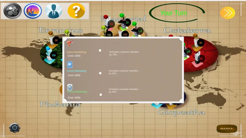 Make your company big! Invest in research, marketing strategies, take care of your finances and grow your business empire across regions to create the biggest company!