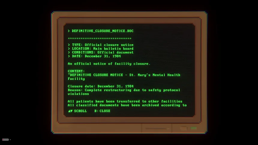 Explore an abandoned psychiatric hospital. Read over 100 documents that unveil the truth. Survive your own mind as your heartbeat accelerates in the dark. Discover what really happened in 1984. Terror doesn't come from outside: it's born within you.