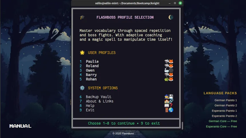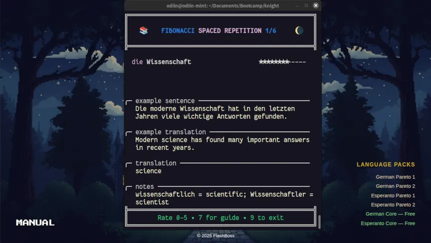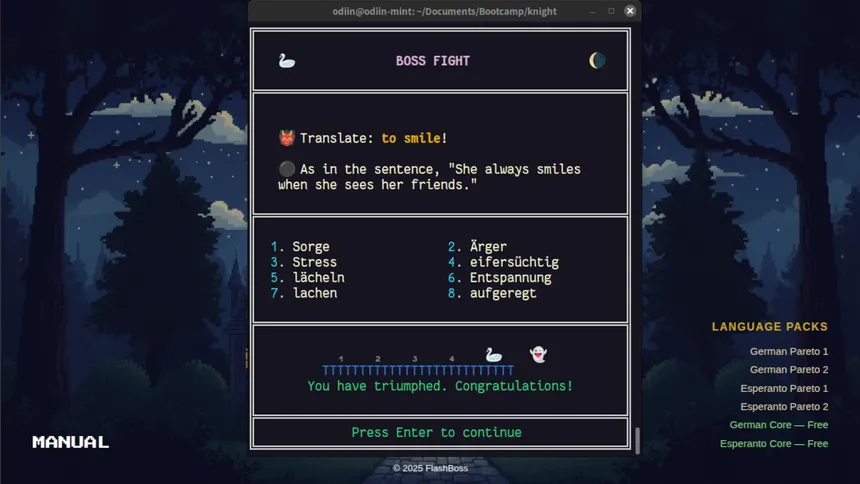 FlashBoss is a terminal-based vocabulary learning game that fuses spaced repetition with RPG mechanics. Review flashcards daily, defeat bosses to unlock new vocabulary clusters, and choose from six masters with distinct personality. Includes German and Esperanto with 1000 words each and full audio.