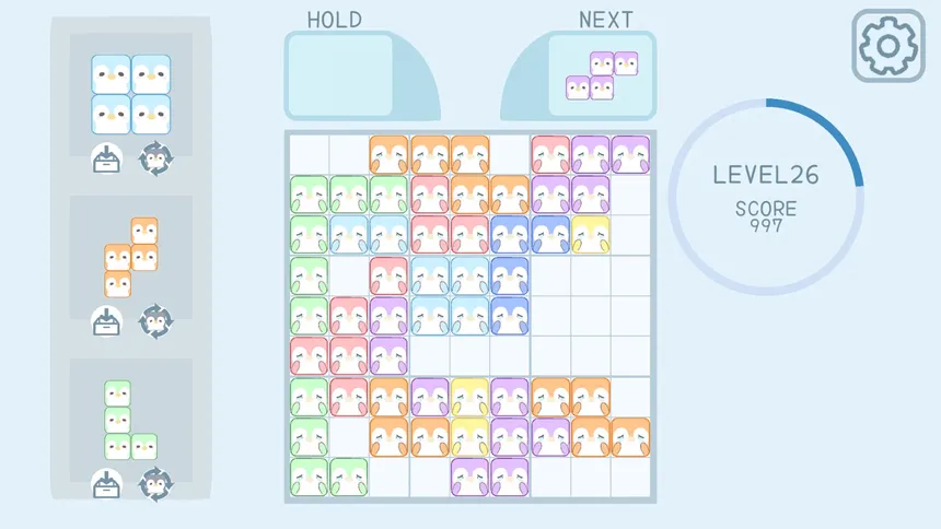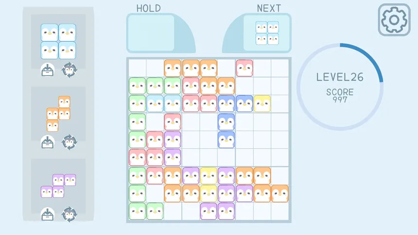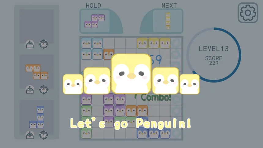 Penguins have turned into blocks!? This simple puzzle game involves placing blocks on the board and clearing them by lining up vertical, horizontal, and 3x3 areas.