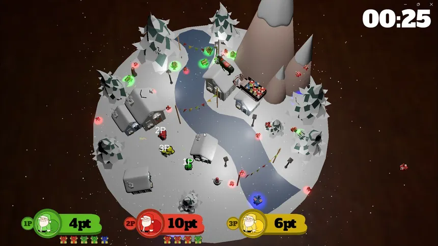 King of Santa is a competitive party action game for up to four players, where players take on the role of Santa, collect presents scattered across the stage, and deliver them to chimneys to earn points and win the match.