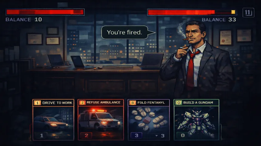 A darkly humorous roguelike card game about a regular office worker learning to accept the Kill Line. Build your deck and calculate risk between rent, healthcare, and work—see how far the system allows you to go. Failure isn’t an accident. It’s part of the rules. Now you can finally see it.
