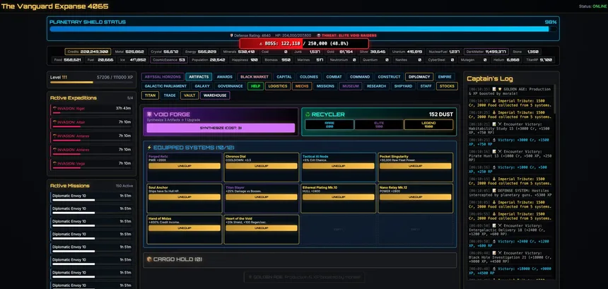 Command humanity's last hope in a deep incremental strategy RPG. Features a procedurally evolving universe with 1,000+ dynamic commodities, infinite loot tables, and massive fleet battles. Build from a single drone to Dyson Spheres. Will you save humanity or rule the ashes?