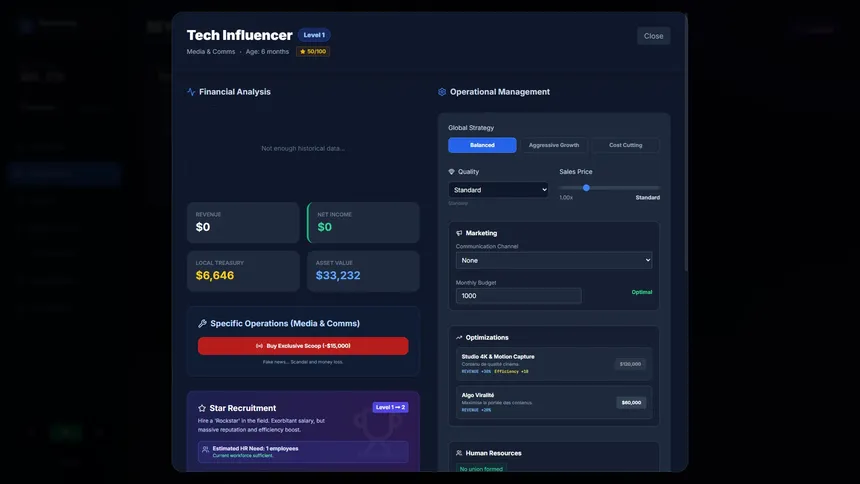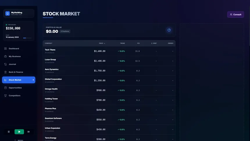Global Business Tycoon is a strategic management game where you build a global empire as a visionary CEO, making high-stakes decisions to dominate competitive world markets.