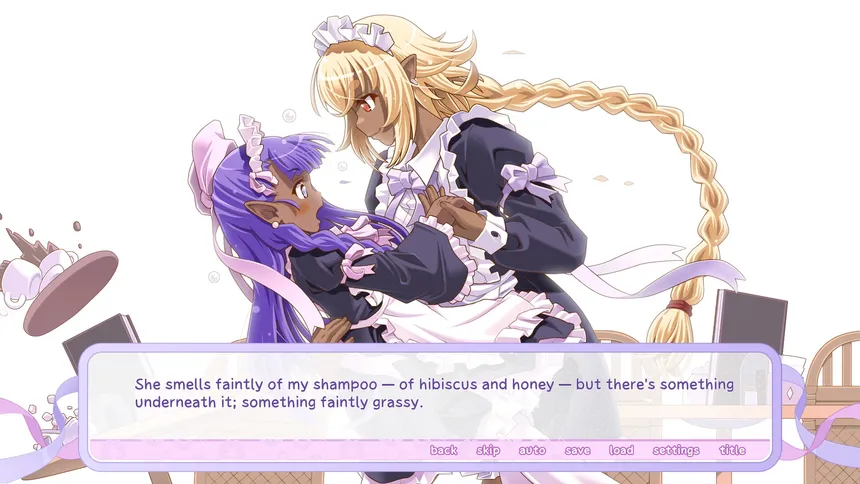 A cute, wholesome yuri visual novel about a teeny-tiny dark elf who falls for her (stupidly tall) childhood friend... quite literally.