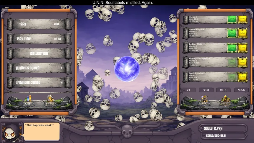 Manage souls, expand purgatory, and assist the Grim Reaper in this darkly humorous idle game. Tap to collect, automate the afterlife, unlock eerie upgrades, where progress never rests...and neither do the dead.