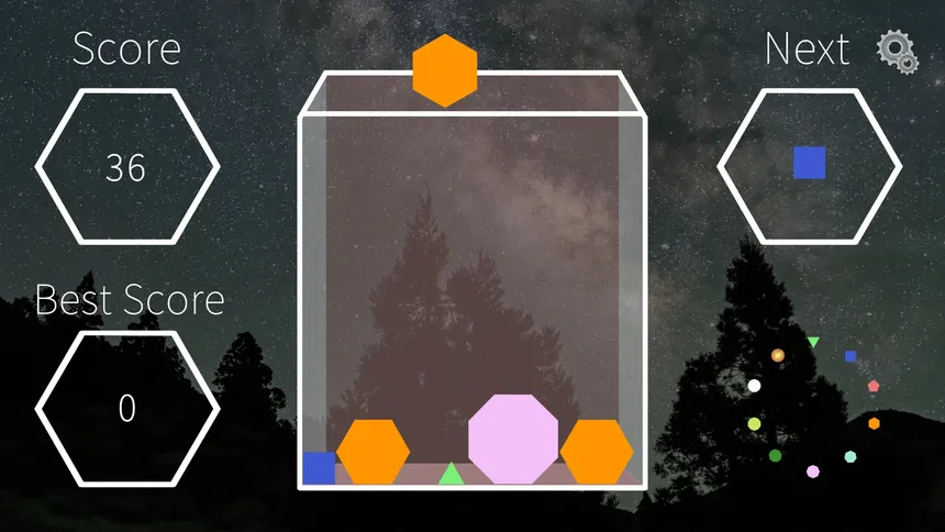 Let’s combine regular polygons to create a circle! For example, you can form a square by combining equilateral triangles. By repeating this process, you can eventually create a circle. Making a circle is your ultimate goal! Keep dropping those polygons into the box one after another.