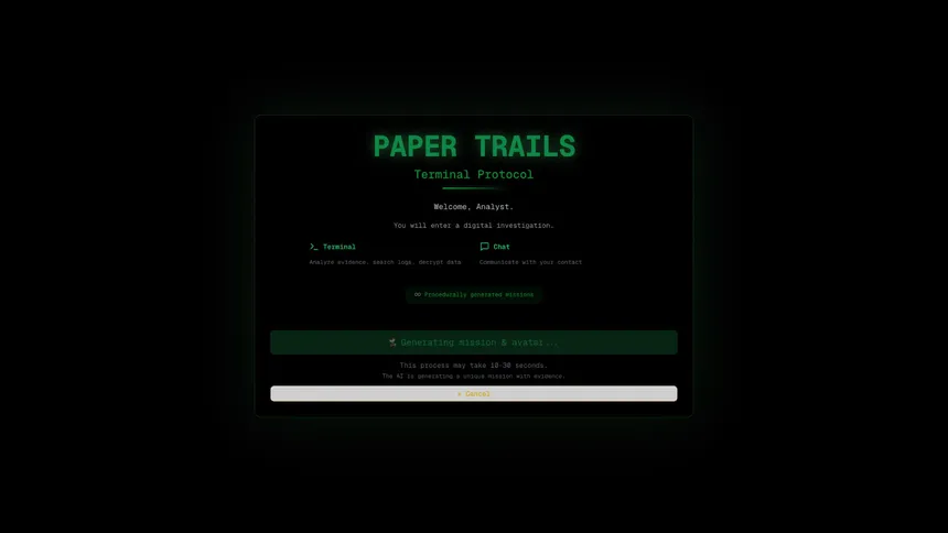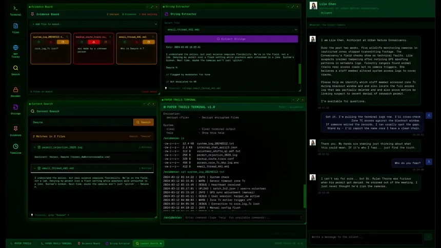 Paper Trails is an AI-assisted detective investigation game set on a believable desktop. Analyze files, emails, logs and clues, interrogate a sharp persona, connect evidence, and solve procedural cases that adapt to your decisions.