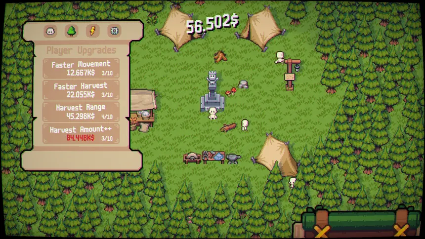 A top down incremental game about harvesting resources from an eternal forest. Prepare for the woods with items and upgrade your character and helpers. Try to fight off the trees by chopping them. How long can you stay in the forest?