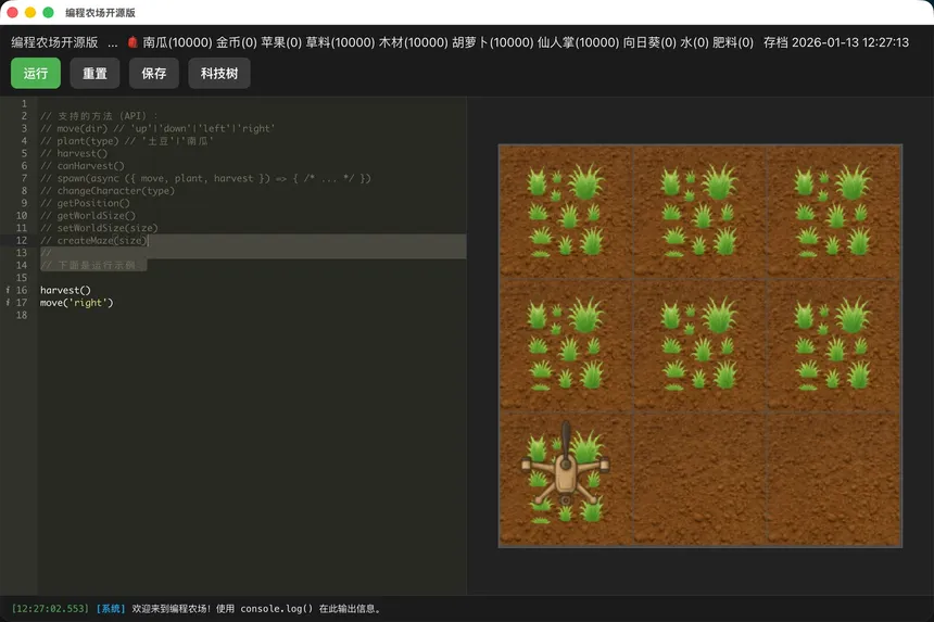 A JavaScript-based coding farm game. Inspired by The Farmer Was Replaced. The core goal is to help players learn programming by writing code that controls characters in a 2D farm.