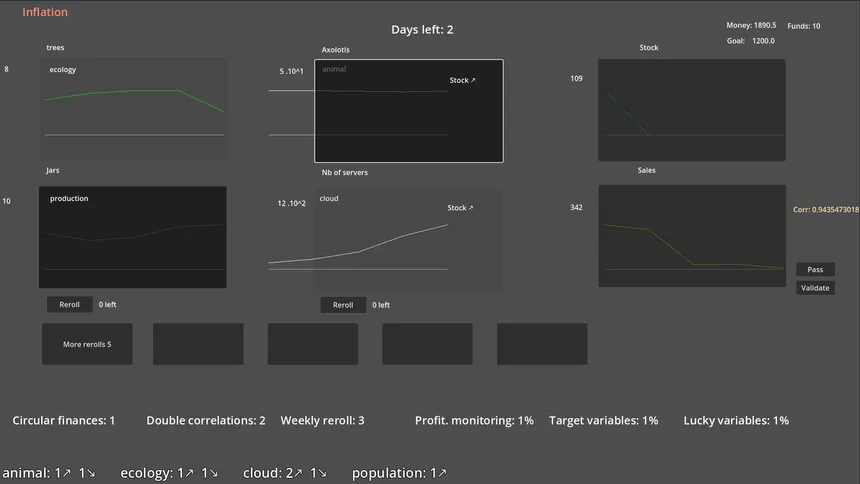 A strategy game about correlations and bending reality for profit. You’re hired to increase a company’s sales—by any means necessary. Link variables together and transform changes in the world into revenue. More penguins? Somehow, that means higher sales. Don’t question it. Optimize it.
