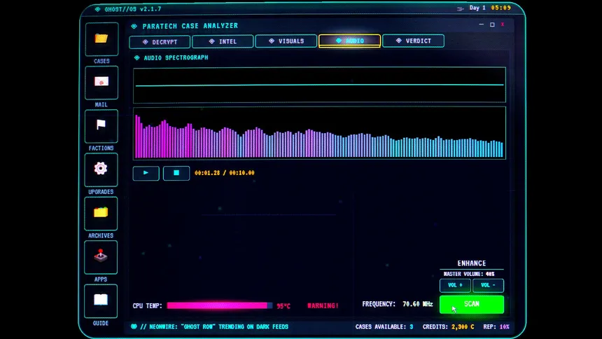 A cyberpunk paranormal detective sim played entirely through a CRT terminal. Analyze evidence, expose hoaxes, and survive faction politics before rent is due.
