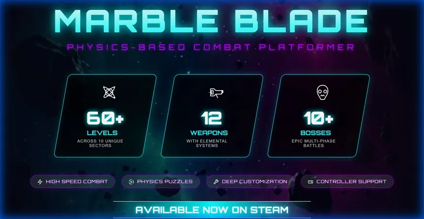 Marble Blade — игра от компании Baker Games Studios, разработанная для платформы PC. Проект совмещает в себе такие жанры и элементы, как экшен и rpg. Дополнительно игроки выделяют такие особенности игры, как экшен-рогалик, платформер на точность, 3d-платформер и боевые гонки. Игра рассчитана на одиночное прохождение, многопользовательские режимы не предусмотрены.