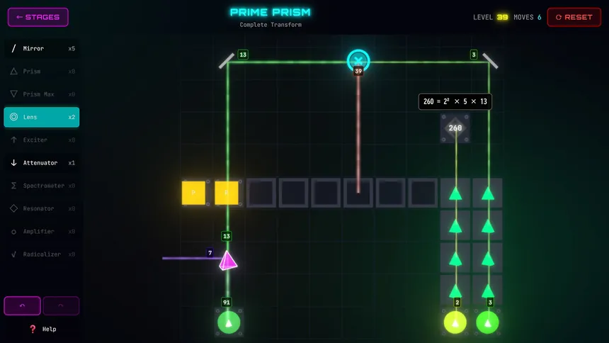 Numbers are light; logic is the lens. "Prime Prism" is a pure logic puzzle game themed around prime numbers and factorization. Construct circuits of light using optical tools like "Prisms" and "Lenses" to decompose and synthesize numbers. Over 140 stages across 11 worlds await your challenge.