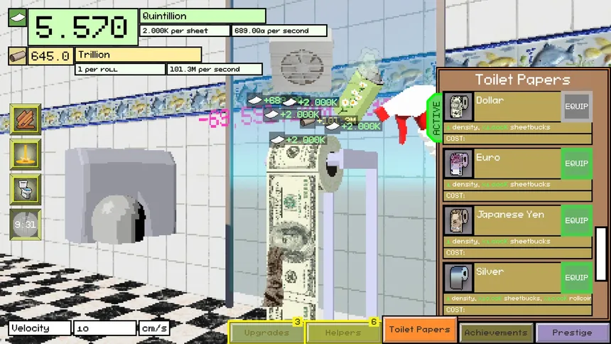 Toilet Paper Idle is a chill incremental idle clicker game about consuming as much toilet papers as possible with the help of helpers, skills, and upgrades. Discover special types of toilet papers as you progress, and be careful to not clog your toilet!