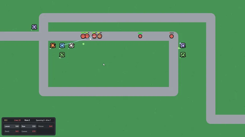 Hydra TD is a classic tower defense game. Place and upgrade towers to stop enemy waves, including periodic boss encounters. Play through a campaign of maps, then continue into an endless mode to see how long you can last.