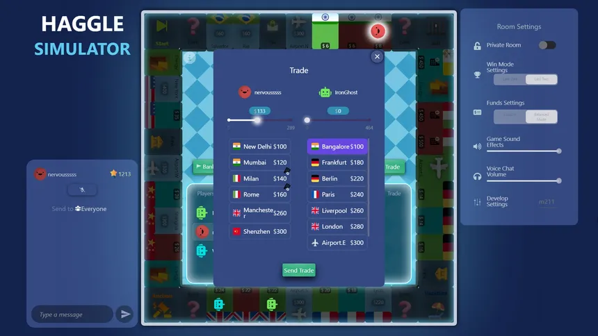 A Monopoly-style board game focused on negotiation, trading, and bidding between players. You can take out loans from the bank, but be careful—late payments may result in asset repossession! Trade via group chat or private messages to avoid too much noise. Come and sharpen your haggling skills!