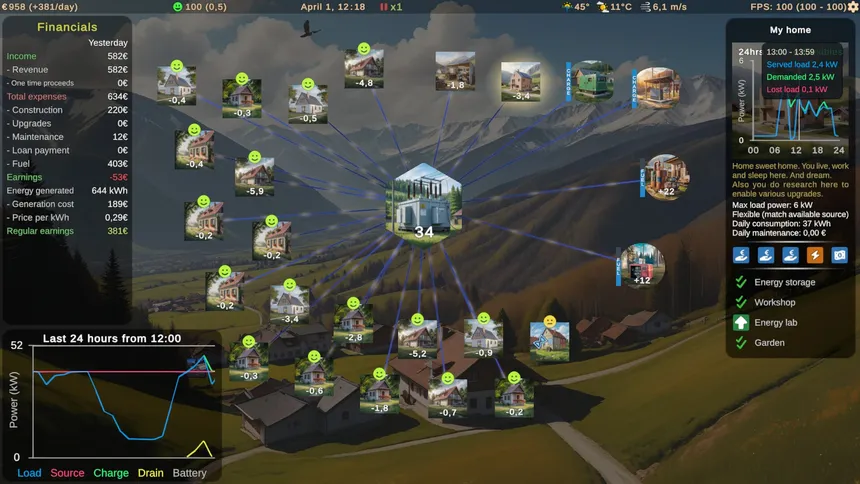Build electric grid in small settlement. Advance from outdated generators to modern powerplants, use fossils and renewables. Accomodate growing customer base and weather changes. Farms or mines provide extra income. Map-free layout with drag-and-drop simplicity. Simulation based on european data.