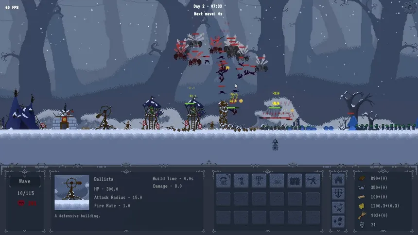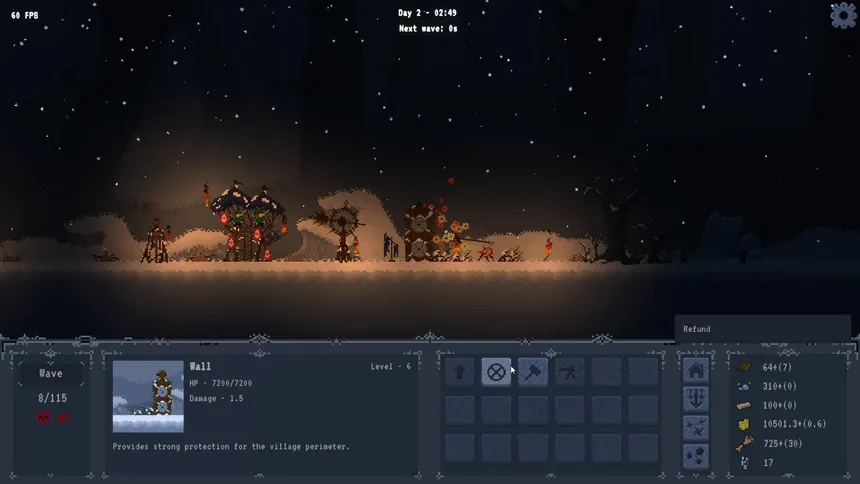 2D tower defense with resource management. Defend against 120 waves of enemies while building your settlement. Manage 5 resources, construct towers, recruit units, and upgrade buildings to survive.