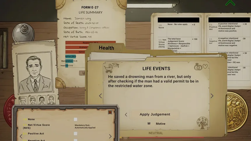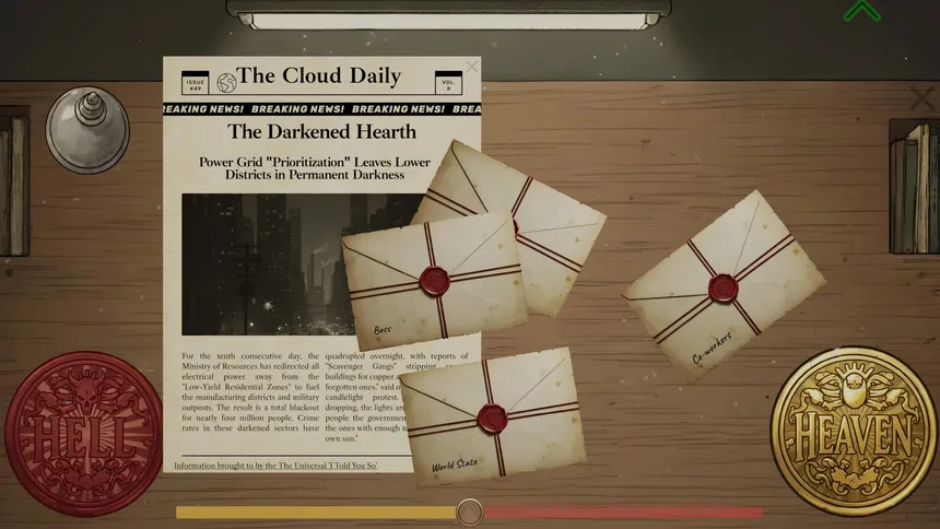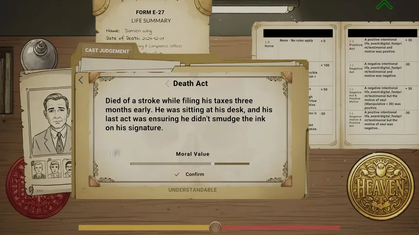 Your job is simple: Review life events of the dead to determine if they deserve Heaven or Hell. But when the Company manual demands you condemn the innocent, you face a choice: follow orders to protect your family, or your morals to save a soul. Your stamps shape the world—and your salary!